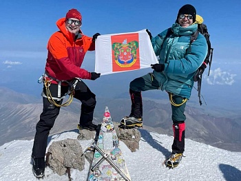 Альпинисты из Сочи таким образом выразили благодарность парку за предоставленную базу для тренировок. Полотнище с гербом развернули на высотке 5642 метра над уровнем моря — это самый высокий горный пик России и Европы.