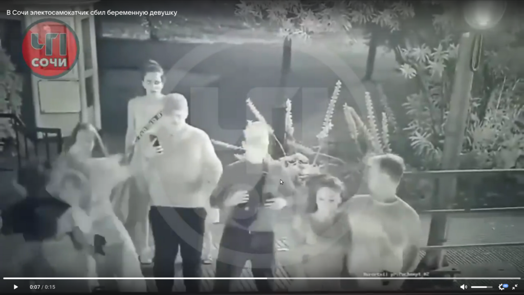 На записи хорошо видно, как толпа людей стоит на тротуаре перед пешеходным переходом в ожидании зеленого человечка. Через три секунды загорается сигнал и люди начинают переходить дорогу, в этот момент по дороге едет водитель с пассажиром на эслектросамокате и на всей скорости сбивает беременную женщину. От удара все падают на асфальт.